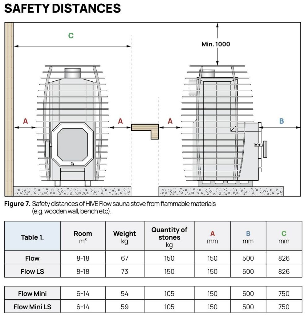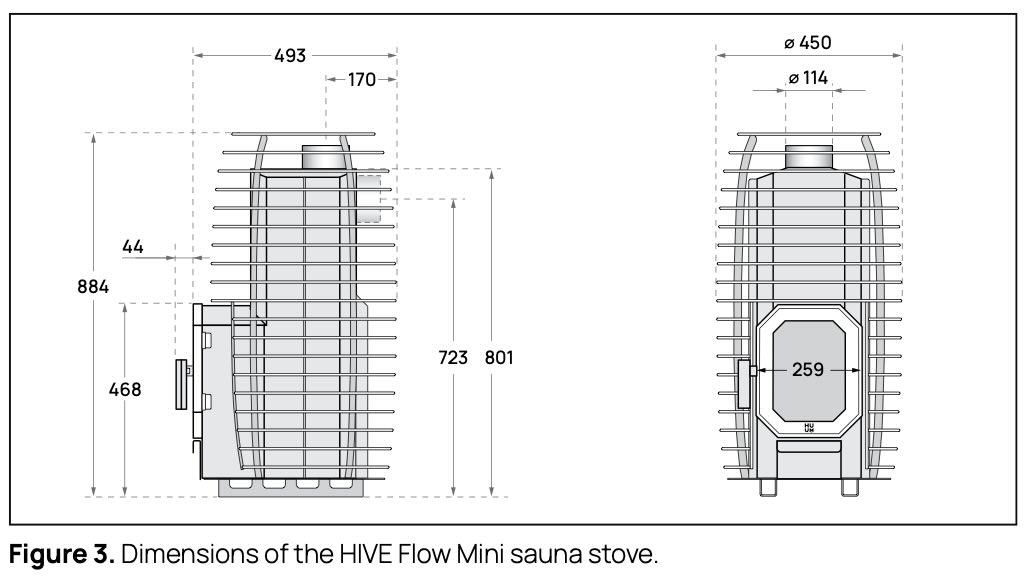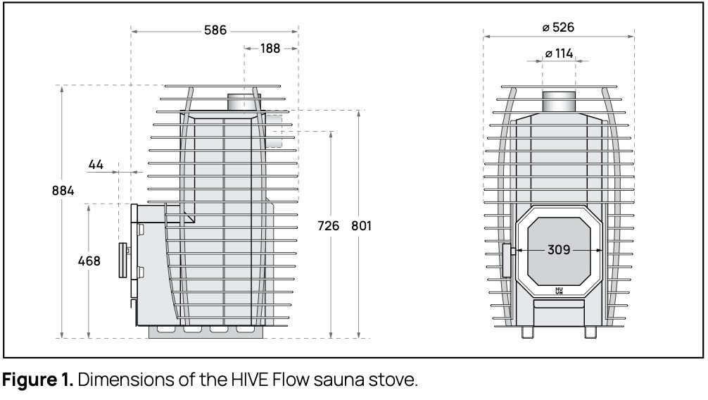 Thanks to its unique design, the HIVE Flow stove has reduced fire risk, allowing for snug installation compared to traditional heaters. The stove features a robust structure with a 5 mm top and 3 mm thick sides, ensuring even heat distribution. The HIVE Flow weighs 67 kg and can hold up to 150 kg of stones, with an additional 35-40 kg in the stone cage. Mini version is 54 kg and can hold up to 105 kg of stones.
