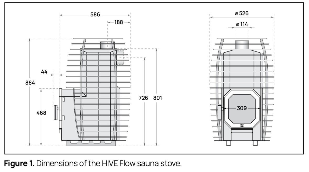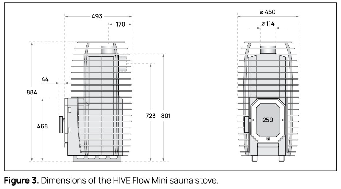Thanks to its unique design, the HIVE Flow stove has reduced fire risk, allowing for snug installation compared to traditional heaters. The stove features a robust structure with a 5 mm top and 3 mm thick sides, ensuring even heat distribution. The HIVE Flow weighs 67 kg and can hold up to 150 kg of stones, with an additional 35-40 kg in the stone cage. Mini version is 54 kg and can hold up to 105 kg of stones.
