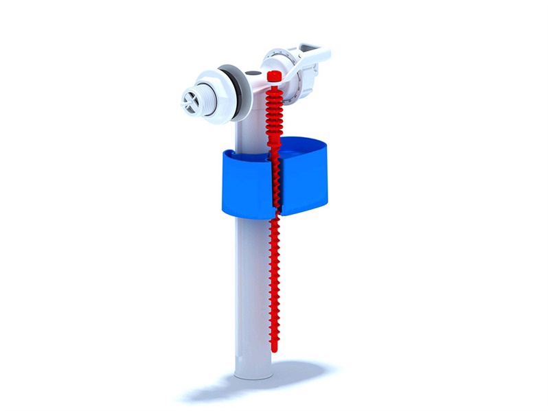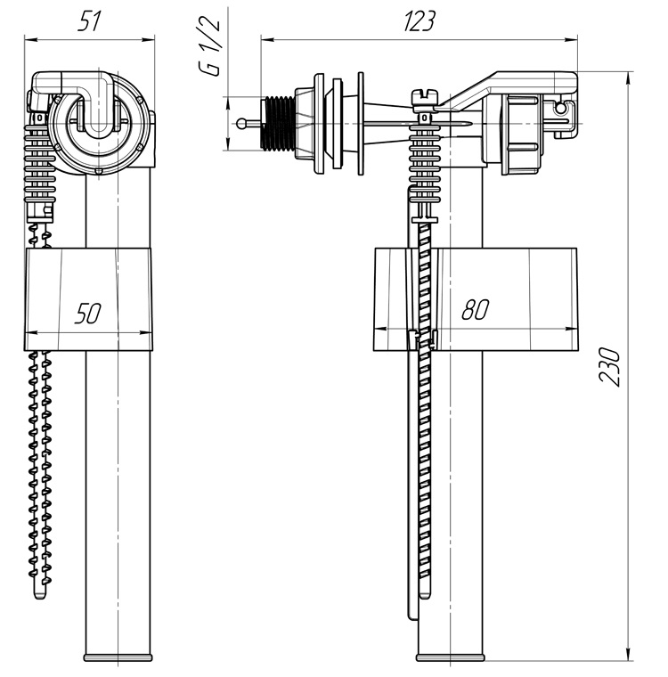 Filling valve with 1/2 ” connection thread (for connection from the side of the flushing box). Made of plastic. Height: 230 mm, width: 123 mm, depth: 51 mm.